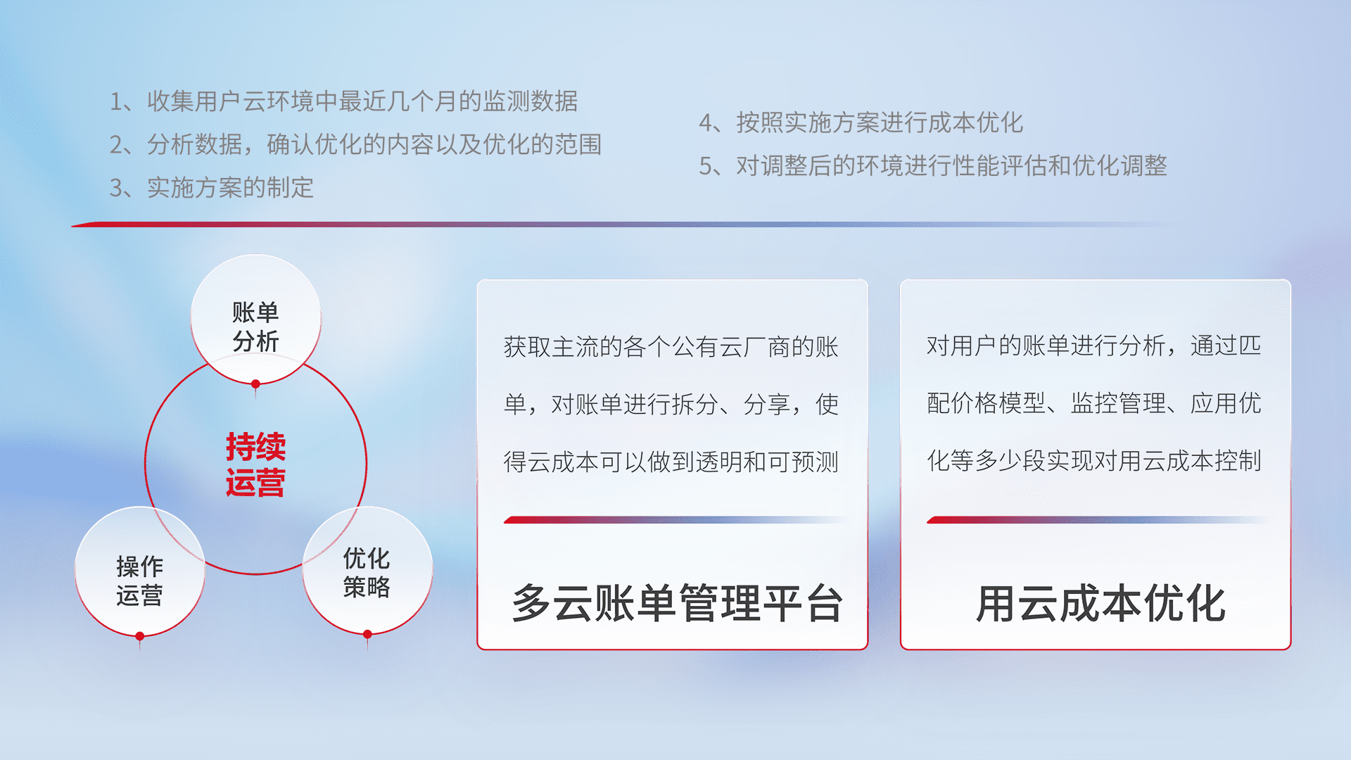 通过多云纳管,,以统一的资源数据模型把客户的云资源进行抽象和封装,,,,进而实现对多云资源的统一操作,,,,保障云资源管理的可靠性、、、、稳定性与可用性。。。量身定制化运维内容,,,配置、、、开发运维、、、补丁管理、、备份、、监控、、认证和访问管理、、、审计和日常巡检等,,,,保障在用云过程中的可靠度,,稳定度以及高可用率。。